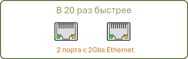 Оба Ethernet порта работают на скорости 2Гбит/с, это означает, что каждый порт в 20 раз быстрее стандарта Fast Ethernet (10/100 Мбит/c)