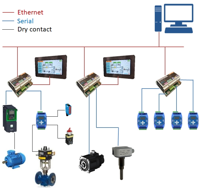Контроллеры Плутон-CS применяются для систем управления и автоматизации малого и среднего уровня в таких направлениях как: пищевое производство, упаковка, транспортирование, конвейеры, складская логистика, различные виде печей и нагревателей, насосы, вентиляция и кондиционирование, тепловые пункты и пр. Существует две архитектуры: классическая и распределенная. Контроллер Плутон-CS с поддержкой концепции промышленного интернета вещей IIoT идеально подходит для распределенных систем управления. Классическая (Иерархическая) архитектура.