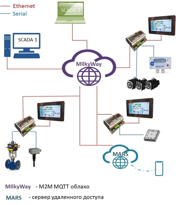Данная архитектура необходима для реализации концепции эффективных SMART (умных) производств, при которой все технологические процессы связаны не через главный (центральный) контроллер, а через информационное M2M облако (MQTT server). Это позволяет увеличить надежность, т.к. каждая система работает автономно, независимо от главного контроллера и его загрузки, а также избежать затрат на дорогостоящий центральный контроллер. Кроме того, распределенная система позволяет предоставить каждой службе только ей необходимые данные, для обеспечения максимального реагирования, что также увеличивает эффективность и надежность производственного процесса. Мы подготовили свою собственную платформу MilkyWay для реализации распределенной архитектуры.