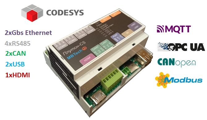 Контроллер Плутон-CS может быть оснащен следующими видами интерфейсов: RS485, CAN, Gbs Ethernet, HDMI, USB, SD и поддерживает протоколы Modbus RTU/TCP, CANopen, OPC UA (server), MQTT (client/broker), это дает возможность строить системы управления с большинством производителей драйверов двигателей, SMART сенсоров, преобразователями частоты, панелями управления и др. устройствами.